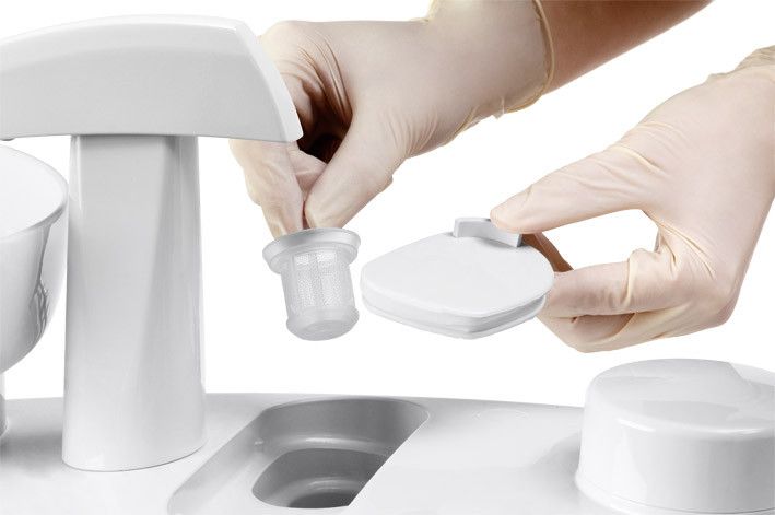 Dokładne i pewnie czyszczenie unitu KaVo ESTETICA E30s jest proste. Najważniejsze elementy, jak: misa spluwaczki, osłony rękawów, czy silikonowa podkładka, można odłączyć od unitu i zdezynfekować. Łatwa wymiana filtrów i proste w czyszczeniu powierzchnie gwarantują utrzymanie higieny na najwyższym poziomie i znaczącą oszczędność czasu.